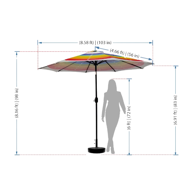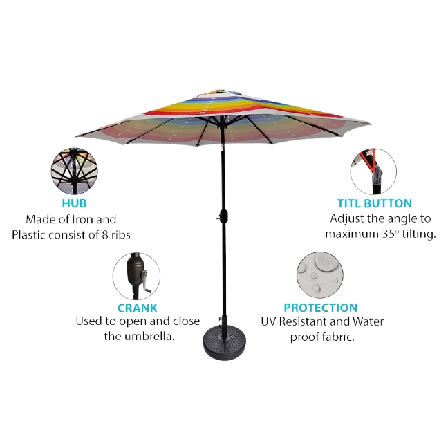 2. Sturdy and Stable Construction: The market umbrellas feature a sturdy pole with eight-rib construction and an anti-skid base. The combination of concrete and rubber padding in the base provides stability and prevents the umbrella from slipping or tipping over. This ensures that the umbrella remains securely in place even in windy conditions, giving you peace of mind.